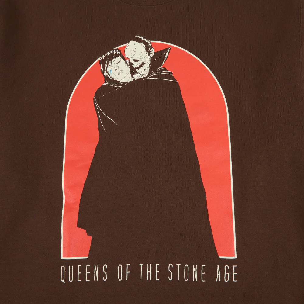 Brown Crewneck Sweatshirt with QOTSA "Like Clockwork" Front Graphic and "Q Logo" back screen printed graphics.