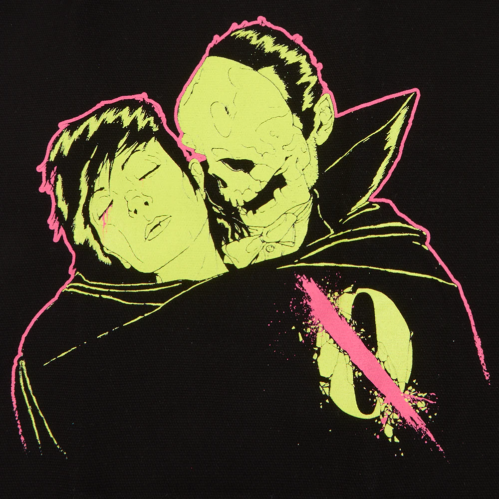Black tote bag with "Like Clockwork" and "Queens of the Stone Age" screen printed graphics.